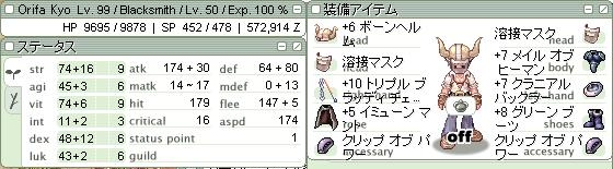 | 1ヶ月でLv98->Lv99達成。コモド後のSP回復式変更と廃兄貴のうまさがあいまって、VIT-BSでもLv99いけました。 コモド前はLv96で、Lv99になるには後9ヶ月かかるかなぁと悠長なことを考えていましたけど、2ヶ月でカンストです。 |