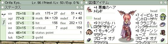 BSのスキルポイントを露店に振って、自家製武器商人って感じ。 AGI100止めの予定が、どうせ99になったら狩に行かないだろうということでAGIにさらにつぎ込むことに。 1stよりASPDが遅いのはARが切れてるため。あとラウドも切れてた。 今となったらINTに振った方が良かったかな…とちょっぴり後悔。今でも享子の息抜きに廃屋でソドメ振ってます。 |