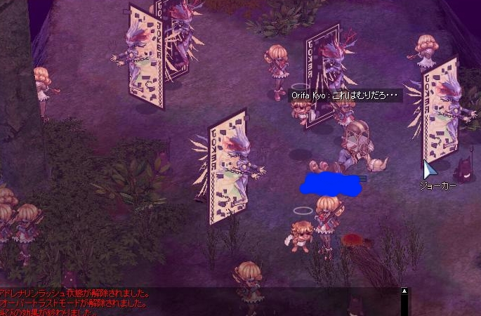 で、カボチャイベントなんですが1回目でにカボチャ部屋、2回目でGF4Fに飛べました。カボチャ部屋は出た瞬間WizのSG&ジャックの大群に飲み込まれて成仏。SGなきゃなぁ。 GF4Fではジョーカーやデビルチ、ヴァイオリーにフェイクエンジェルという顔ぶれでした(レイドリックいなかったな)。最初はソロで何とか 裁いていたけど、途中でソロプリさんがいたので、なんぱしてPTを組むことに。フェイクエンジェルが聖属性でダメージがなかなか通らないわ、状態変化攻撃を連発してくるわで難敵です。 状態変化を連続で食らうと状態変化エフェクトがバグるしね… こんなんできるか!しかも、この状態に陥るとクライアントの処理もバグバグでめちゃくちゃ重くてほぼ行動不能です。会話は普通のタイミングに出るのにね。 リログして何とか画面表示は回復したけど、激沸きで全滅しました。白ぽもつき、画面内にだーれもいない状態でこれだけ来たら無理です。 なんぱしたプリさんもLv99でったので、死んでも問題なかったので結構楽しめましたが。今度はギルメンと来るかな。